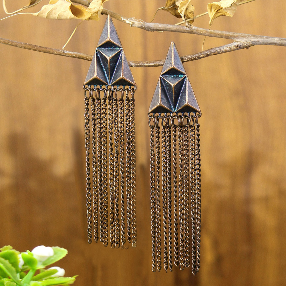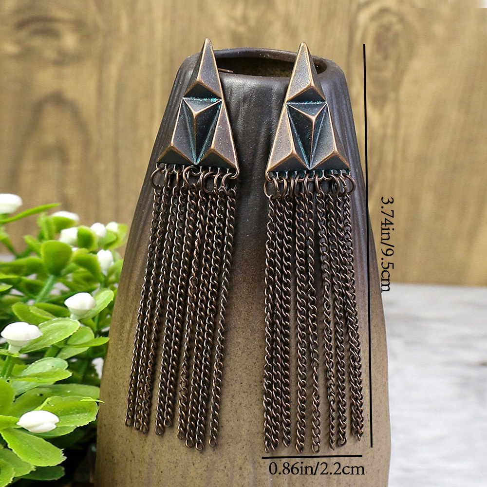1 Pair Of Retro Style Bronze And Blue Geometric Chain Tassel Long Earrings Ethnic Style