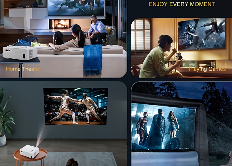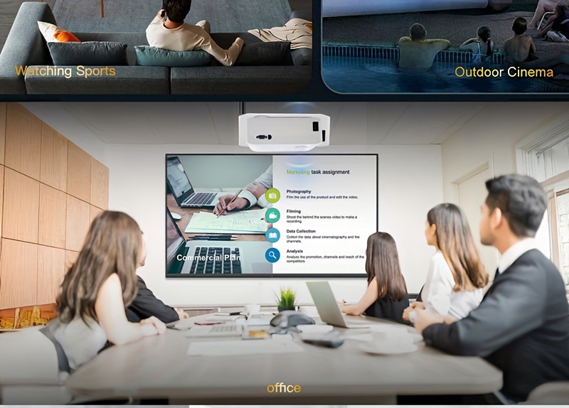 1. Full HD 1080P projector. 2. Features 6G+2.4G WiFi and 5.3 wireless connectivity. 3. 300″ large screen. 4. Comes with an advanced cooling system and operates quietly. 5. Includes built-in speakers. 6. Compatible with table, tripod, and ceiling mounting. 7. Ideal for both indoor and outdoor movie viewing.