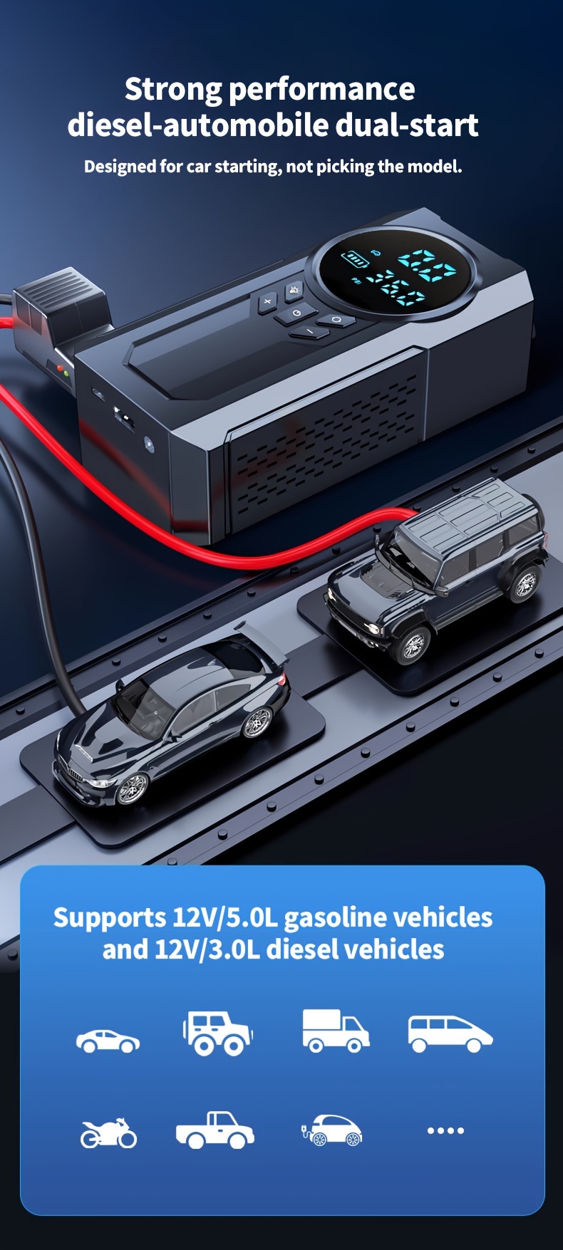 Portable Cordless Car Jump Starter & Tire Inflator – USB Rechargeable, LED Display, Flashlight Feature, Large Capacity Storage