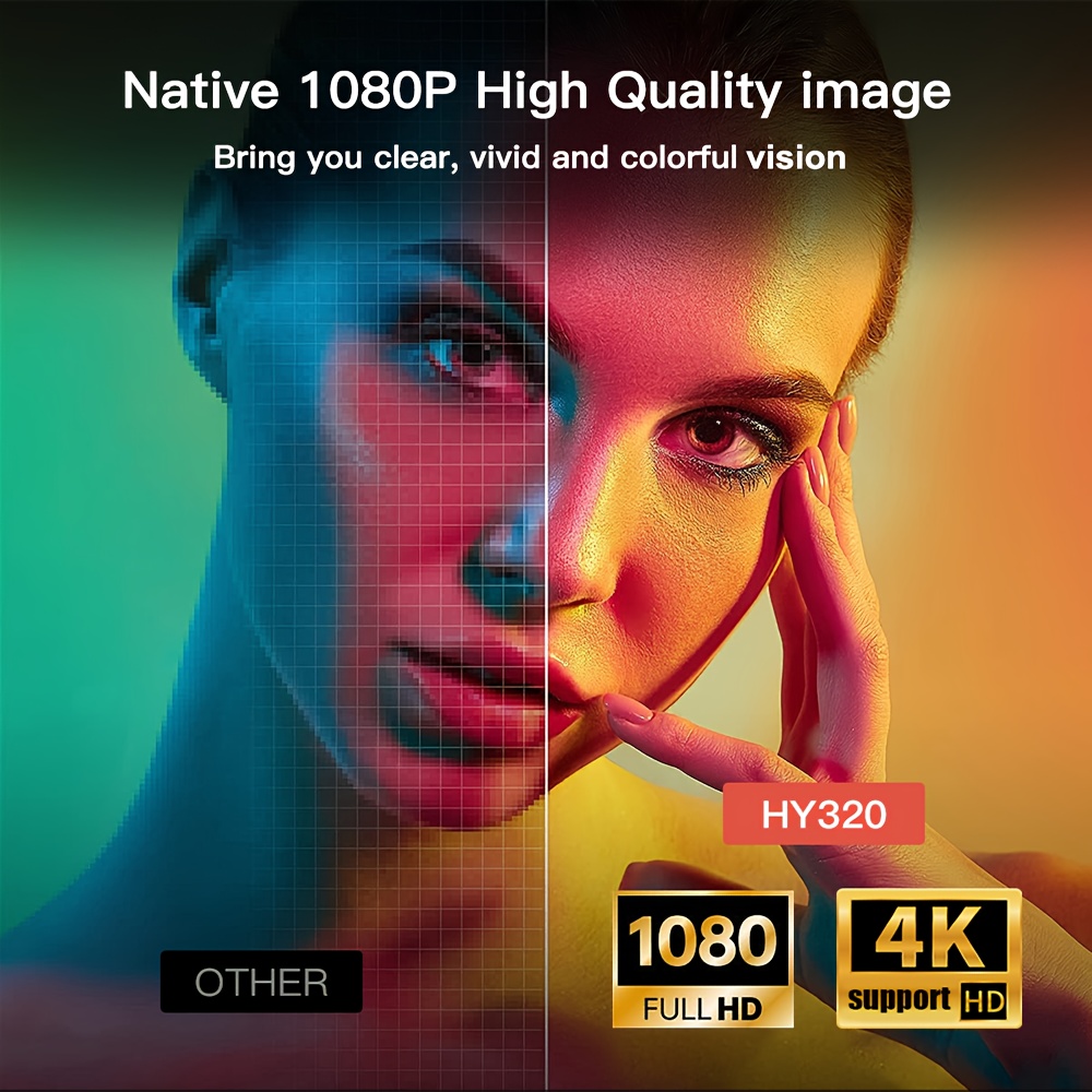 [Native 1080P & support 4K]The HY320 projector is a cutting-edge device that offers stunning native 1080P resolution and supporindividuals 4K for ultra high definition image clarity
