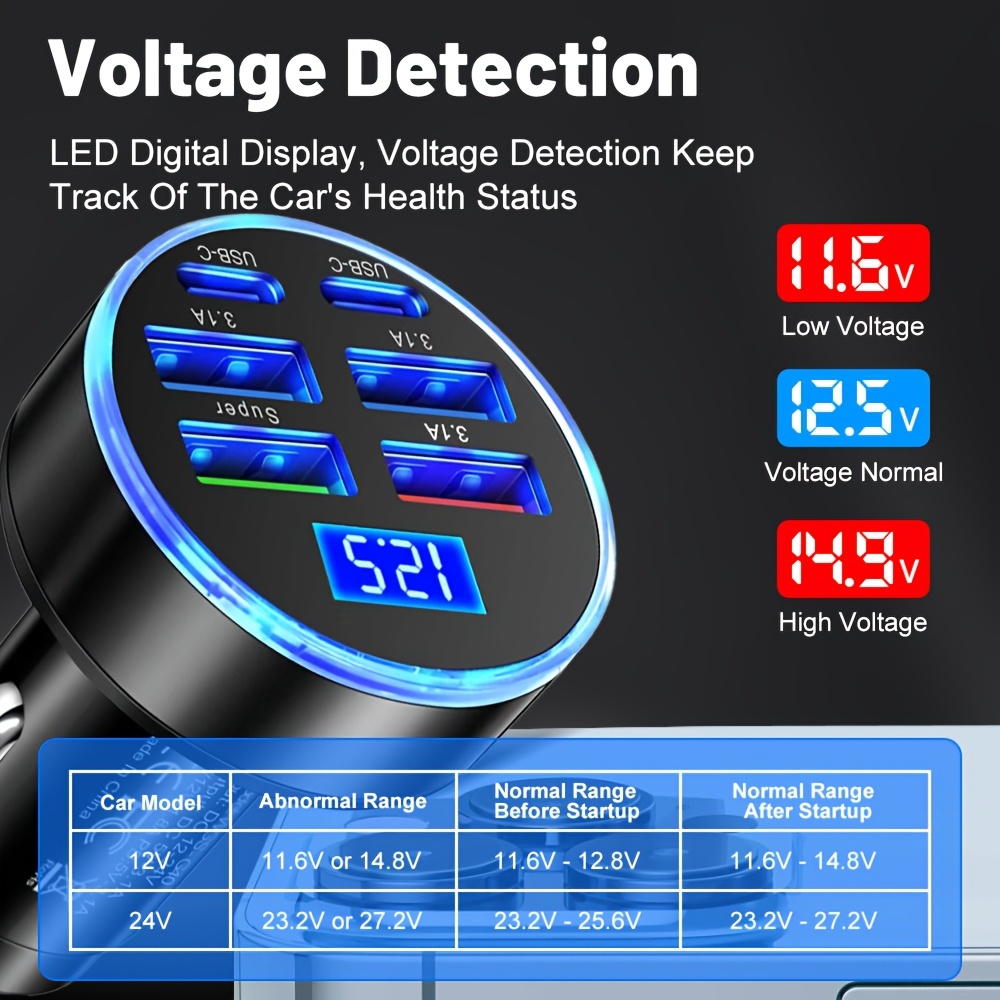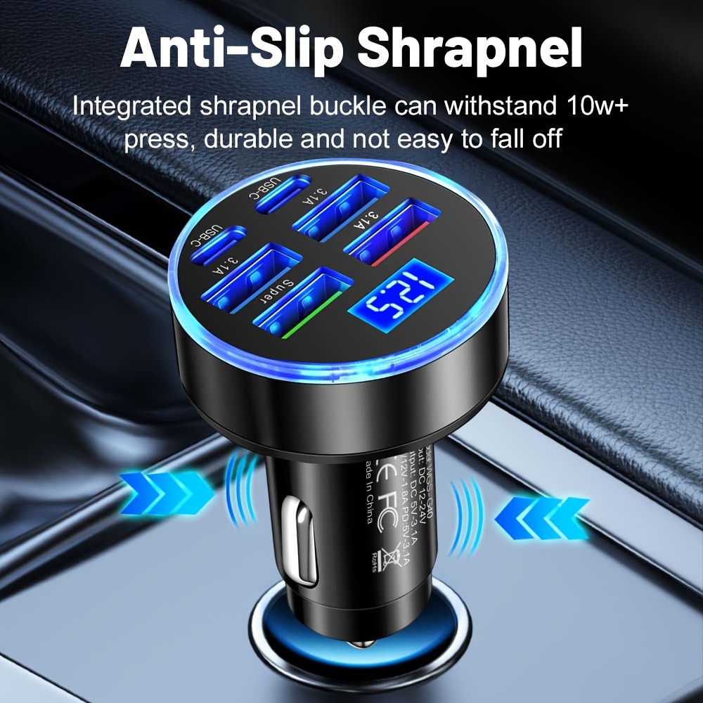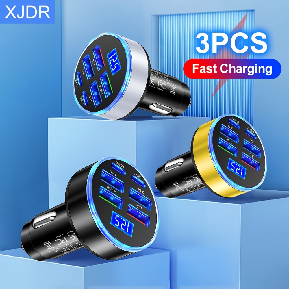 XJDR Silvery/Golden/Black Fast Charge 6 Port Car Phone Charger – QC3.0, Dual USB-C Power Adapter with LED Display for Vehicles