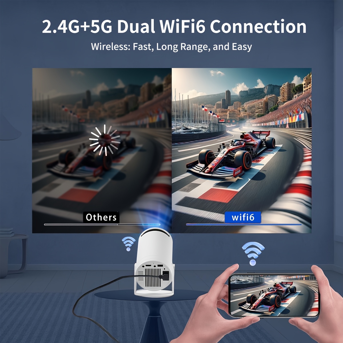 XYA Mini LED Projector Support 1080P video decoding, WiFi6 & Wireless 5.2 Portable Video Projector with Remote Control, 3.3 meter, High brightness, 180° flip, Android OS for Home & Office Use